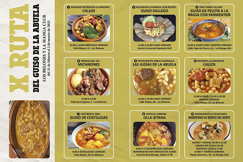 Los Belones y La Manga Club acogen desde este viernes y y hasta el próximo domingo 2 de marzo la X Ruta del Guiso de la Abuela, un evento gastronómico que celebra la cocina tradicional y los sabores de siempre, y al que se han sumado nueve restaurantes de la zona, que ofrecerán distintos platos caseros, elaborados conproductos de la tierra.