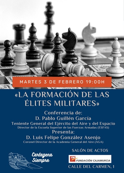 Datos del acto 📅 Martes, 3 de febrero 🕖 19:00 h 📍 Salón de Actos – Fundación Cajamurcia (C/ del Carmen, 1 · Cartagena) 🎓 Conferencia: La formación de las élites militares