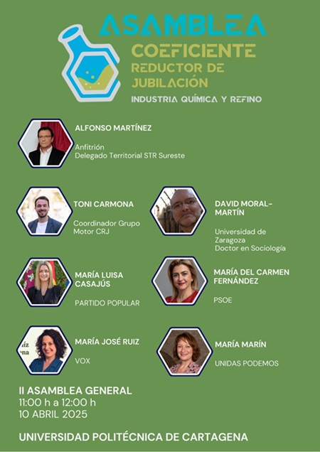 El Grupo Motor por el Coeficiente Reductor del Jubilación (CRJ) para los trabajadores de la industria química y el refino va a celebrar en Cartagena su II Asamblea Nacional. Un encuentro en que se darán cita 150 personas y que se celebrará el mañana jueves 10 de abril en el salón de actos de la Escuela Técnica Superior de Ingeniería Agronómica de la UPCT, sito en el paseo Alfonso XIII.