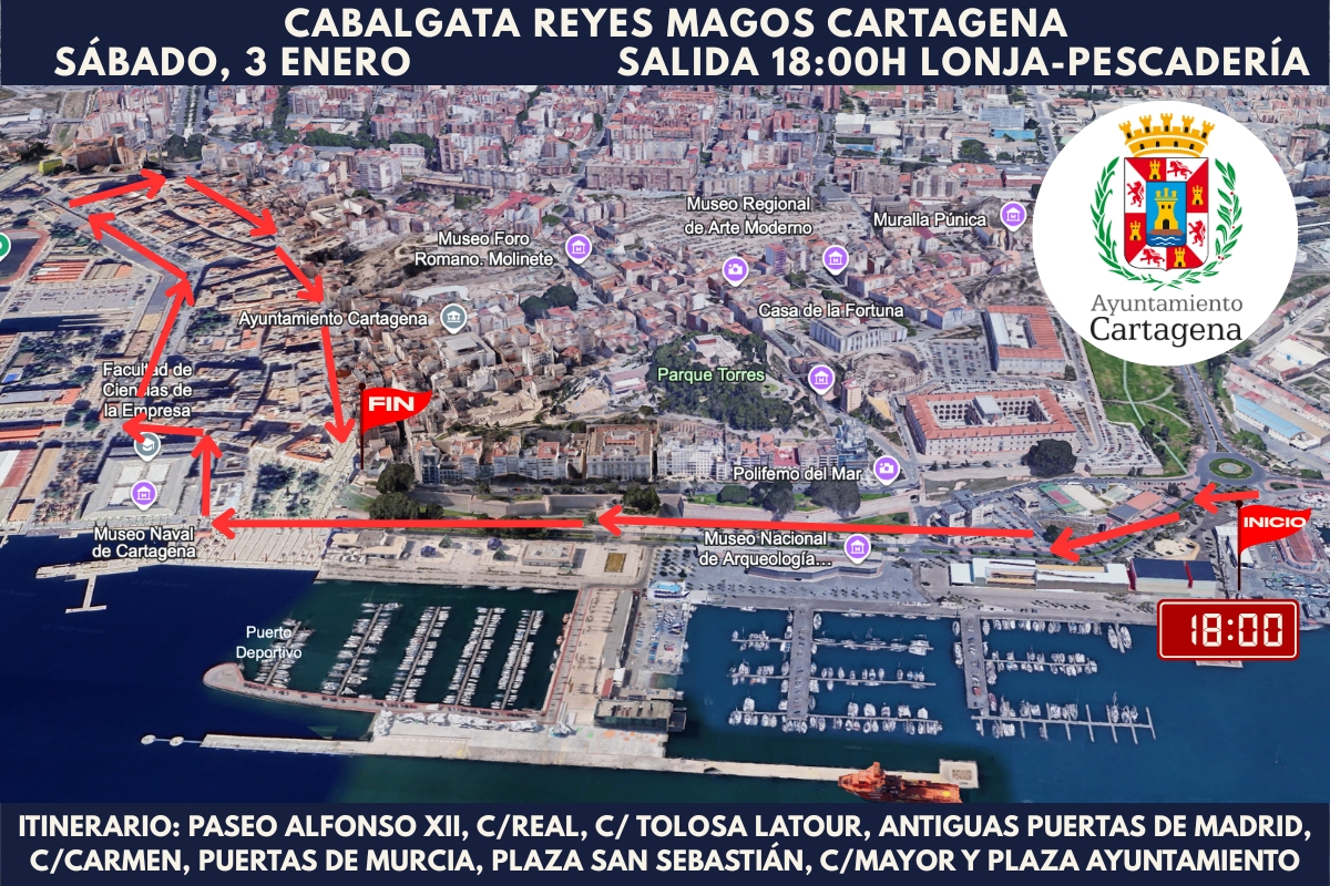 Debido a las previsiones del tiempo para los próximos días, la Gran Cabalgata organizada por el Ayuntamiento de Cartagena, para el próximo 5 de enero, se ha tenido que trasladar a este sábado, 3 de enero; que comenzará a las 18:00 horas, y que saldrá desde la Cofradía de Pescadores, pasando por paseo Alfonso XII, calle Real, calle Tolosa Latour, plaza de las Antiguas Puertas de Madrid, calle del Carmen, Puerta de Murcia, plaza San Sebastián, calle Mayor, y finalizará en la plaza del Ayuntamiento.
