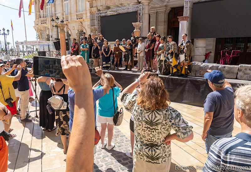 La alcaldesa Noelia Arroyo ha recibido a los festeros en las puertas del Palacio Consistorial. En este enclave se desarrolla esta noche el pregón a partir de las 21:30 horas. El discurso inaugural correrá a cargo de Elena Ruiz Valderas, directora del Museo del Teatro Romano de Cartagena. Antes, Tropas y Legiones protagonizarán el encendido del fuego sagrado desde las ocho de la tarde en el parque arqueológico del Molinete.