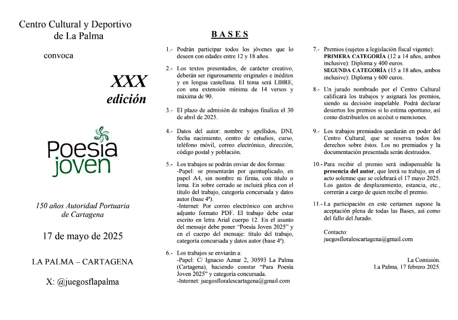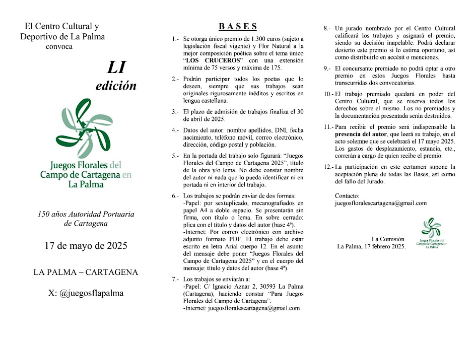 Un año más, el Centro Cultural y Deportivo de La Palma ha convocado los LI Juegos Florales del Campo de Cartagena en La Palma, además se conmemora el 150 aniversario de la Autoridad Portuaria de Cartagena. Para esta convocatoria de 2025 las fechas y premio son: