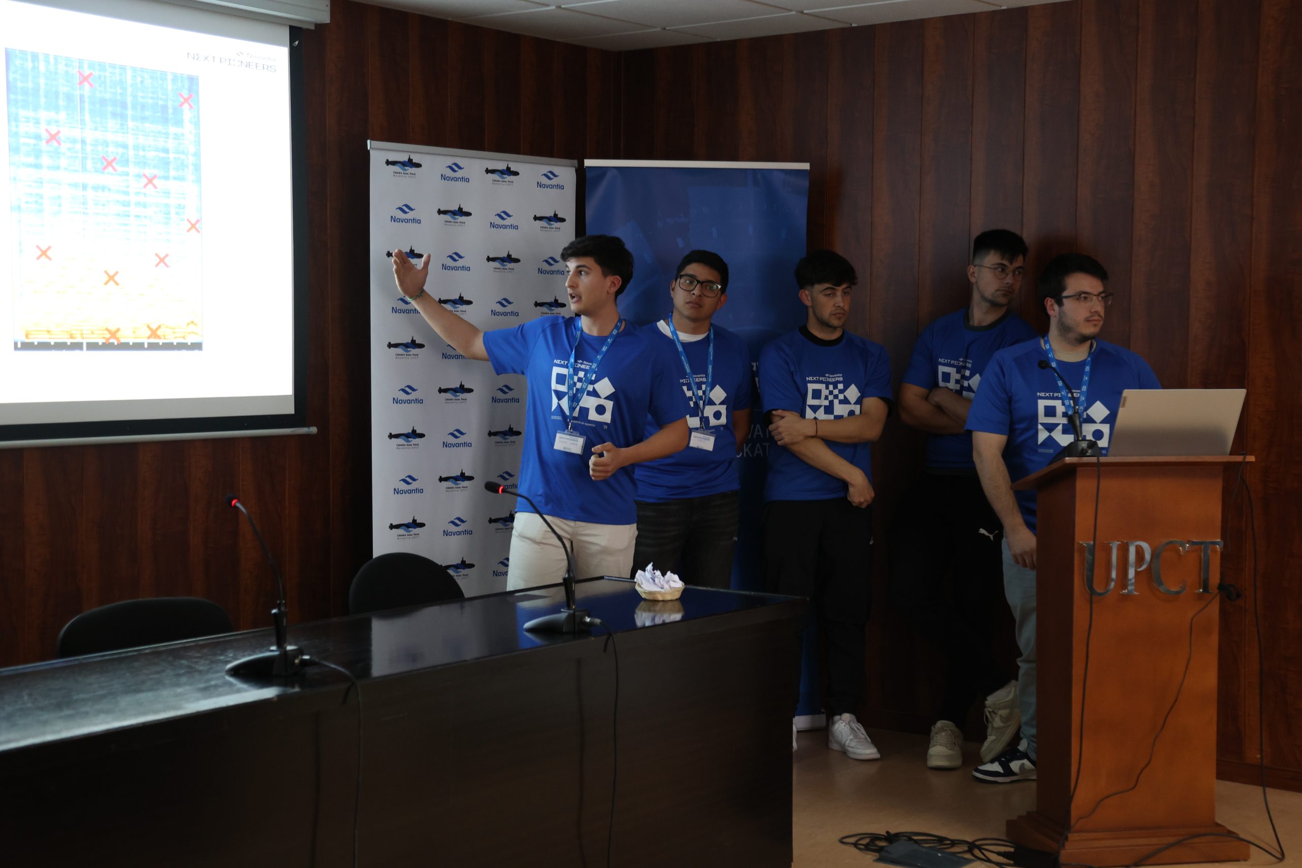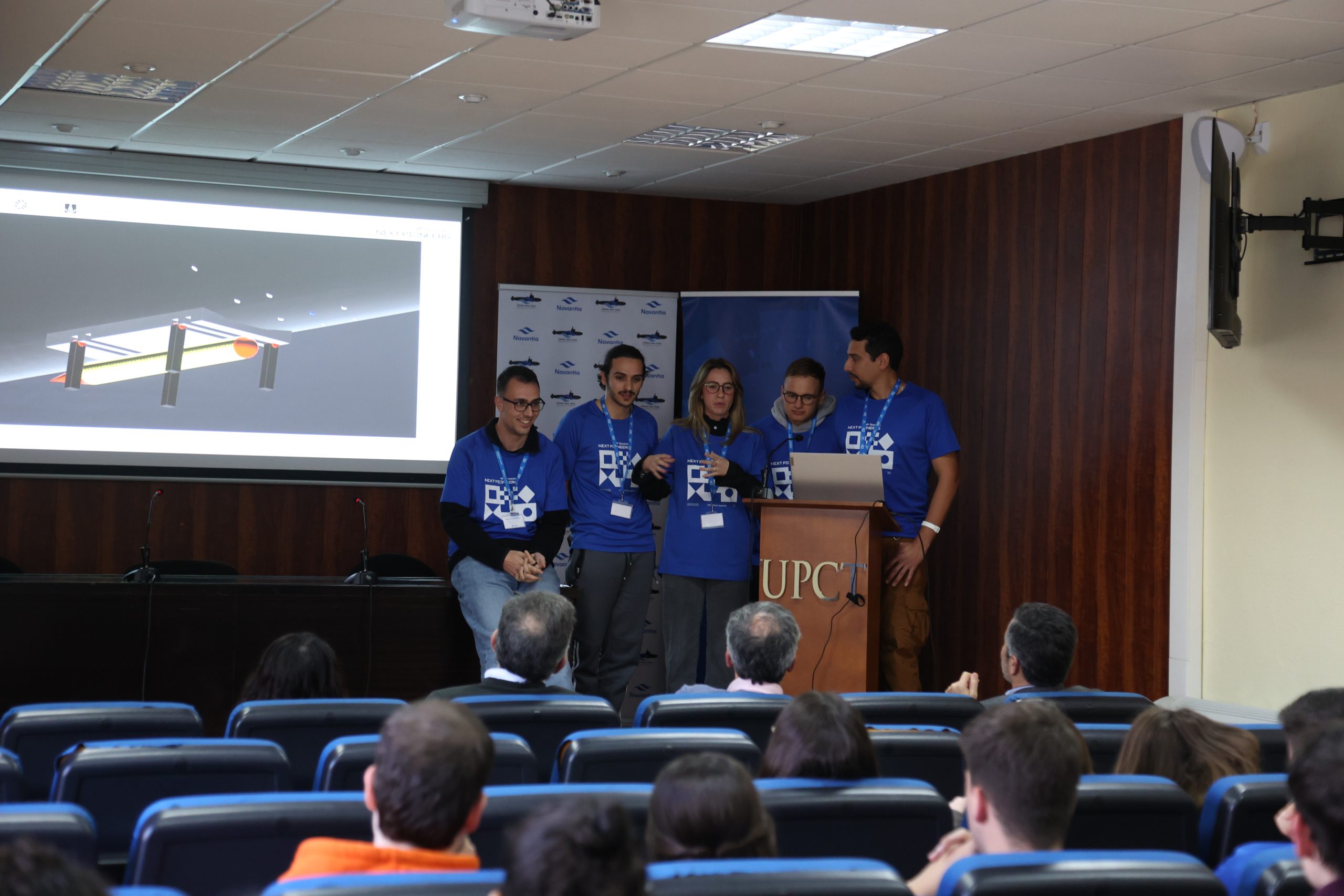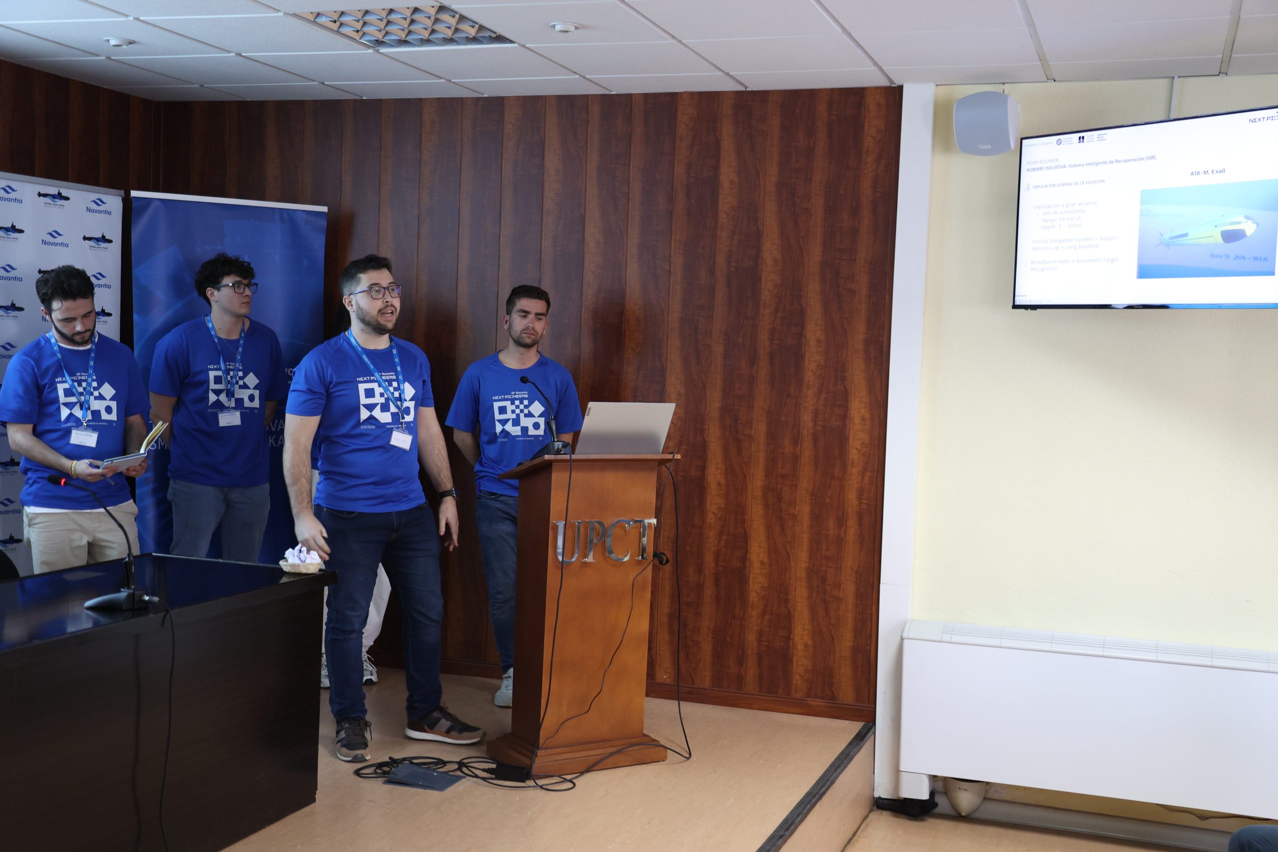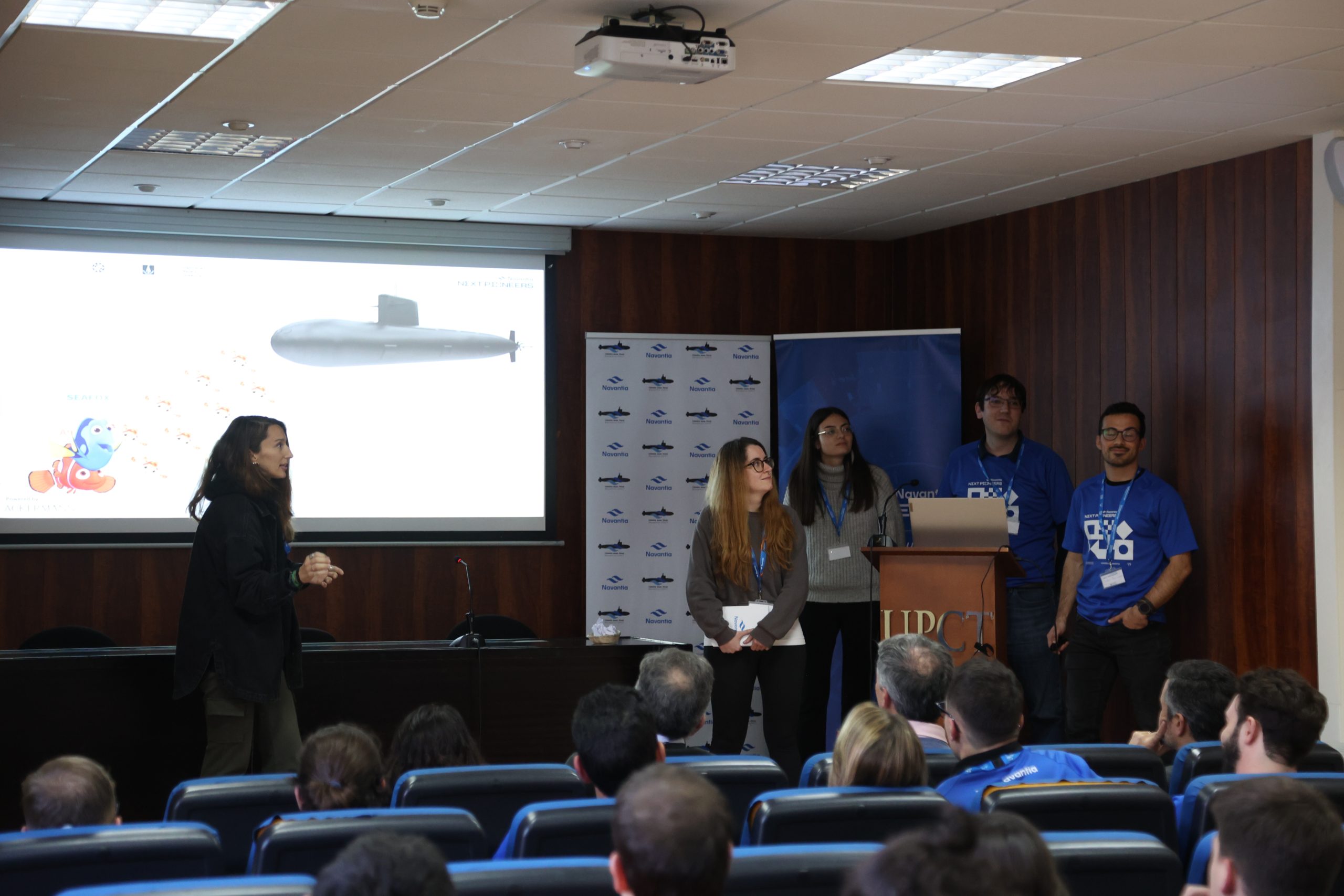El equipo formado por Miguel López Munuera, Carlos Jair Mero Coello, Manuel Lage Martínez, José Antonio Zafra Torres y Juan Antonio González Fiérrez ha ganado el primer Hackathon ‘Navantia Next Pioneers’, celebrado en la Escuela de Navales de la UPCT, con una solución basada en la encriptación de mensajes acústicos para guiar a un dron autónomo hacia un submarino y el uso de bobinas electromagnéticas para recogerlo e integrarlo en el casco a través de una compuerta retráctil.