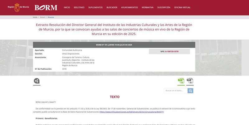 La resolución puede consultarse en el Boletín Oficial de la Región de Murcia o en el apartado ‘Convocatorias’ de la página web del Instituto de las Industrias Culturales y las Artes. El plazo de presentación de las solicitudes concluye el 11 de agosto.