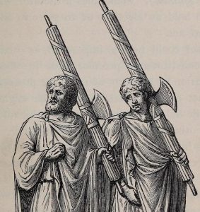 Para realizar su trabajo usaban los “faces” (haces) o lo que es lo mismo, el “hacha” antes mencionaba, la cual representaba la autoridad recibida por el pueblo y la capacidad de “coercitio” sobre los ciudadanos. El haz de lictores estaba compuesto por pequeños pergaminos enrollados en tubos alrededor de la pieza principal en donde estaban los delitos y las penas a cobrar. A día de hoy sería el papel de la Guardia Civil y, si pensamos un poco, nos daremos cuenta que en haz de lictores forma parte del emblema de esta cuerpo de seguridad del estado español.