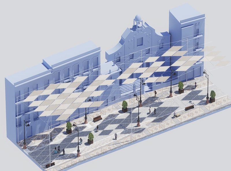 El sistema de sombra urbana se inspira en los mosaicos romanos de la Cartagena antigua, con formas y colores que “constituyen una referencia a nuestra historia”. Se trata de una solución desmontable que estará anclada a las fachadas “allí donde sea técnicamente posible y se sujetará a postes verticales en caso de que se trate de edificios protegidos o haya dificultades técnicas para el anclaje directo”. La solución “reduce la superficie que se opone al viento y, por tanto, minimiza el efecto vela”.