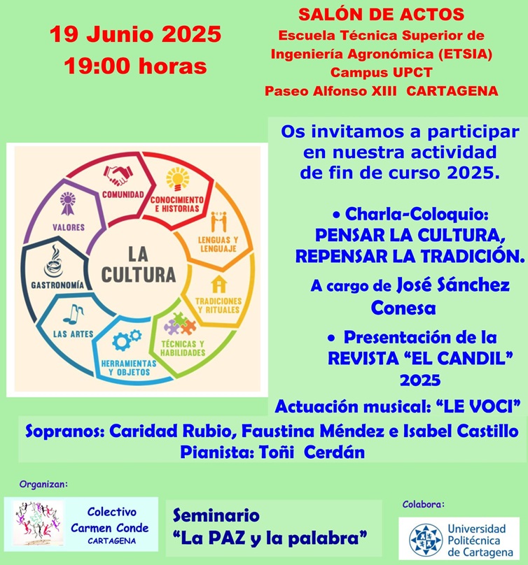 El Colectivo de Educación de Personas Adultas Carmen Conde celebrará su fin de curso con un acto que se llevará a cabo mañana jueves 19 de junio, a las 19:00 horas, en el salón de actos de la Escuela Técnica Superior de Ingeniería Agronómica de la UPCT, situada en el campus del paseo Alfonso XIII. La entrada es libre y gratuita.