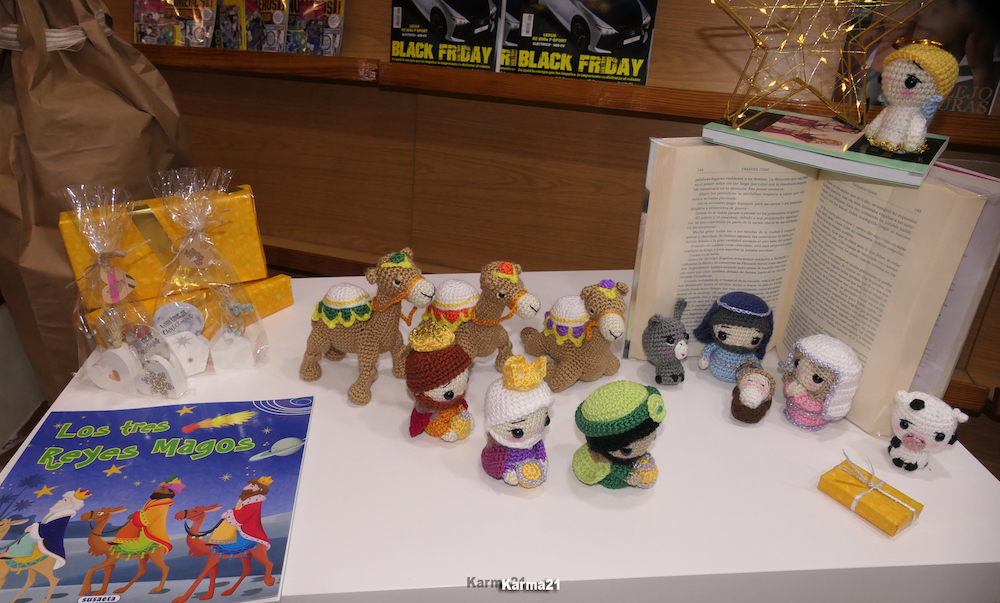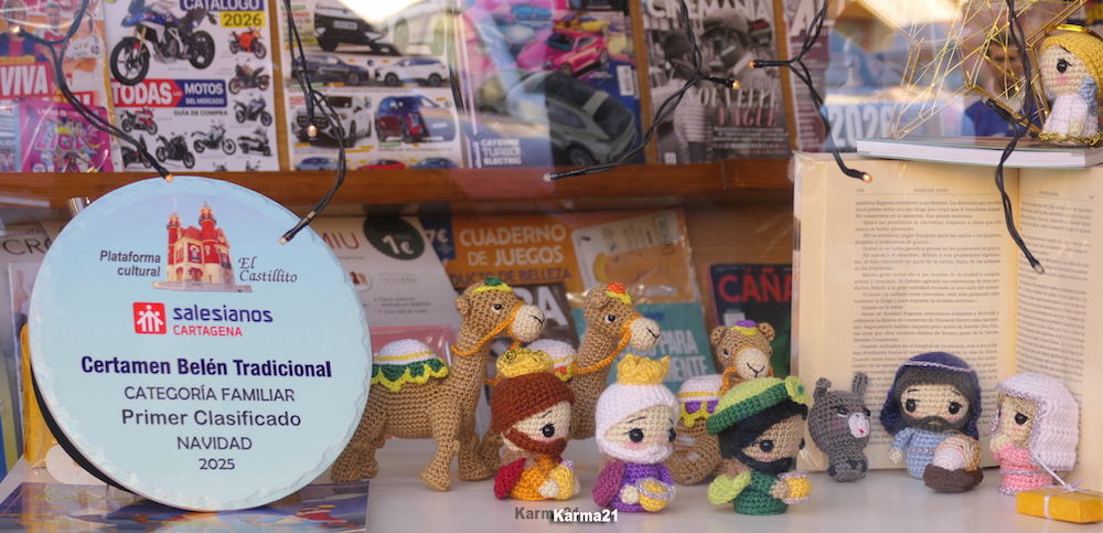 María Caridad Sánchez (Barriada de Hispanoamérica): La vencedora de la categoría de belenes de tamaño pequeño o familiar creó para la Librería Don Bosco, que regenta su hija, un nacimiento elaborado a ganchillo con la sagrada familia, los Reyes Magos y sus camellos, la estrella y un ángel. Su elaboración le llevó varios meses.
