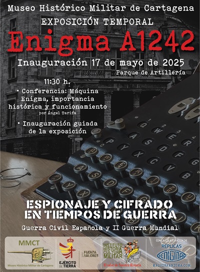 El Museo Histórico Militar de Cartagena presenta la exposición temporal “Enigma A1242. Espionaje y cifrado en tiempos de guerra”, que será inaugurada el próximo sábado 17 de mayo a las 11:30 h. en el Parque de Artillería coincidiendo con la Noche de los Museos. Este evento contará con la presentación de la máquina Enigma A1242, pieza original utilizada durante la Segunda Guerra Mundial y auténtico símbolo del ingenio criptográfico de la época. Una oportunidad única para contemplar una de las escasísimas Enigma auténticas conservadas en el mundo. El acto se iniciará con la conferencia “Máquina Enigma, importancia histórica y funcionamiento” a cargo de Ángel Tarifa, comisario de la exposición, y continuará con la inauguración guiada de la exposición. Una cita imprescindible para los apasionados de la historia, la inteligencia militar y la tecnología. Entrada libre hasta completar aforo.