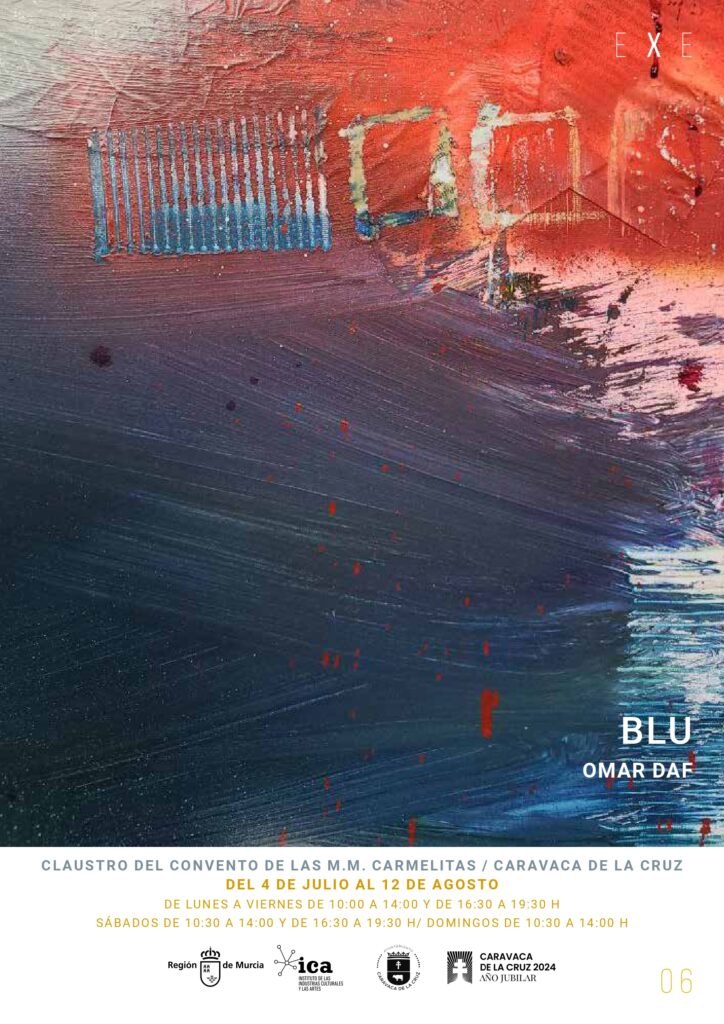 El proyecto seleccionado por el Ayuntamiento de Caravaca de la Cruz traslada la visión del Mediterráneo de Omar Daf, alter ego de Luis Bernardeau, al antiguo convento y está formado por obras que unen capas de intensos colores con textos y están atravesadas por la música, la poesía o el surf. ‘Blu’ abrirá al público en la tarde del 4 de julio y se podrá visitar en el claustro del Convento de las Madres Carmelitas durante todo el mes de lunes a viernes, de 10:00 a 14:00 horas y de 16:30 a 19:30 horas. Los sábados de 10:30 a 14:00 horas y de 16:30 a 19:30 horas; y los domingos de 10:30 a 14:00 horas.