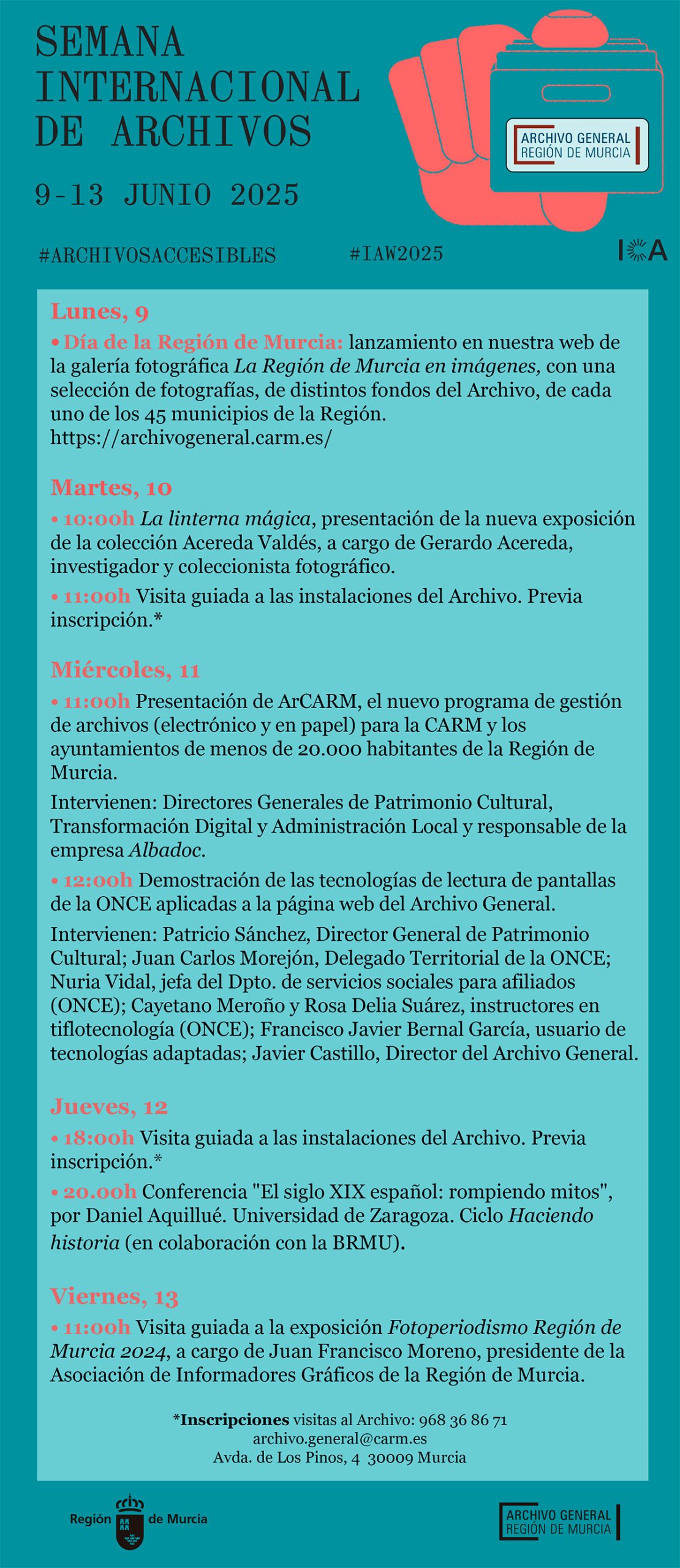 Durante toda la semana se realizarán visitas guiadas a las instalaciones del Archivo, incluyendo sus áreas técnicas y una selección especial de documentos históricos. Estas visitas requieren inscripción previa a través del correo archivo.general@carm.es o del teléfono 968 368610.