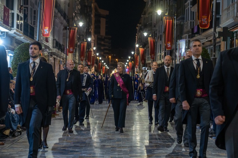 La corporación municipal del Ayuntamiento de Cartagena, encabezada por la alcaldesa Noelia Arroyo, participó este Viernes Santo en la tradicional procesión del Santo Entierro, uno de los desfiles más sobrecogedores de la Semana Santa cartagenera, declarada de Interés Turístico Internacional. La comitiva acompañó al trono del Santo Sepulcro en su recorrido por el casco histórico.