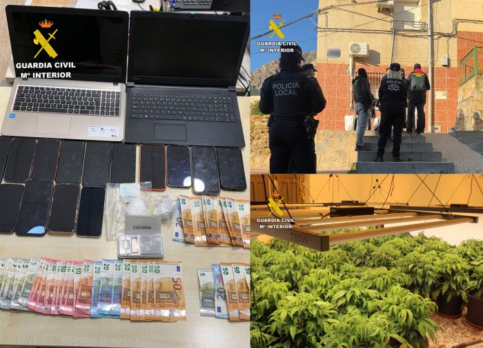 Se han incautado más de 400 plantas de cannabis sativa, 50 gramos de cocaína y 320 gramos de cogollos de marihuana listos para su distribución, 14 teléfonos, dos ordenadores, una carabina de aire comprimido y los útiles empleados para el cultivo interior de la marihuana