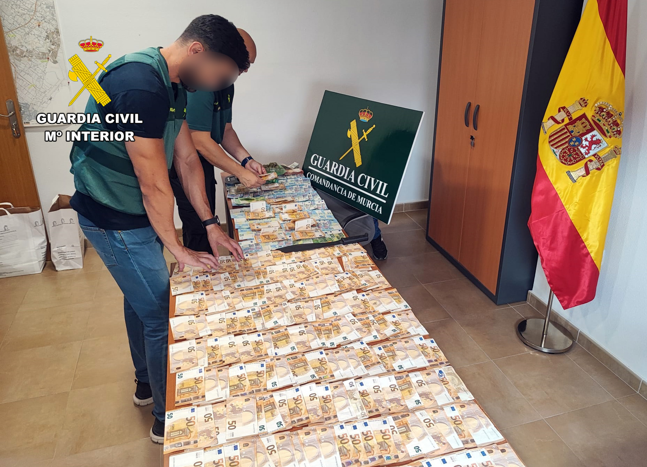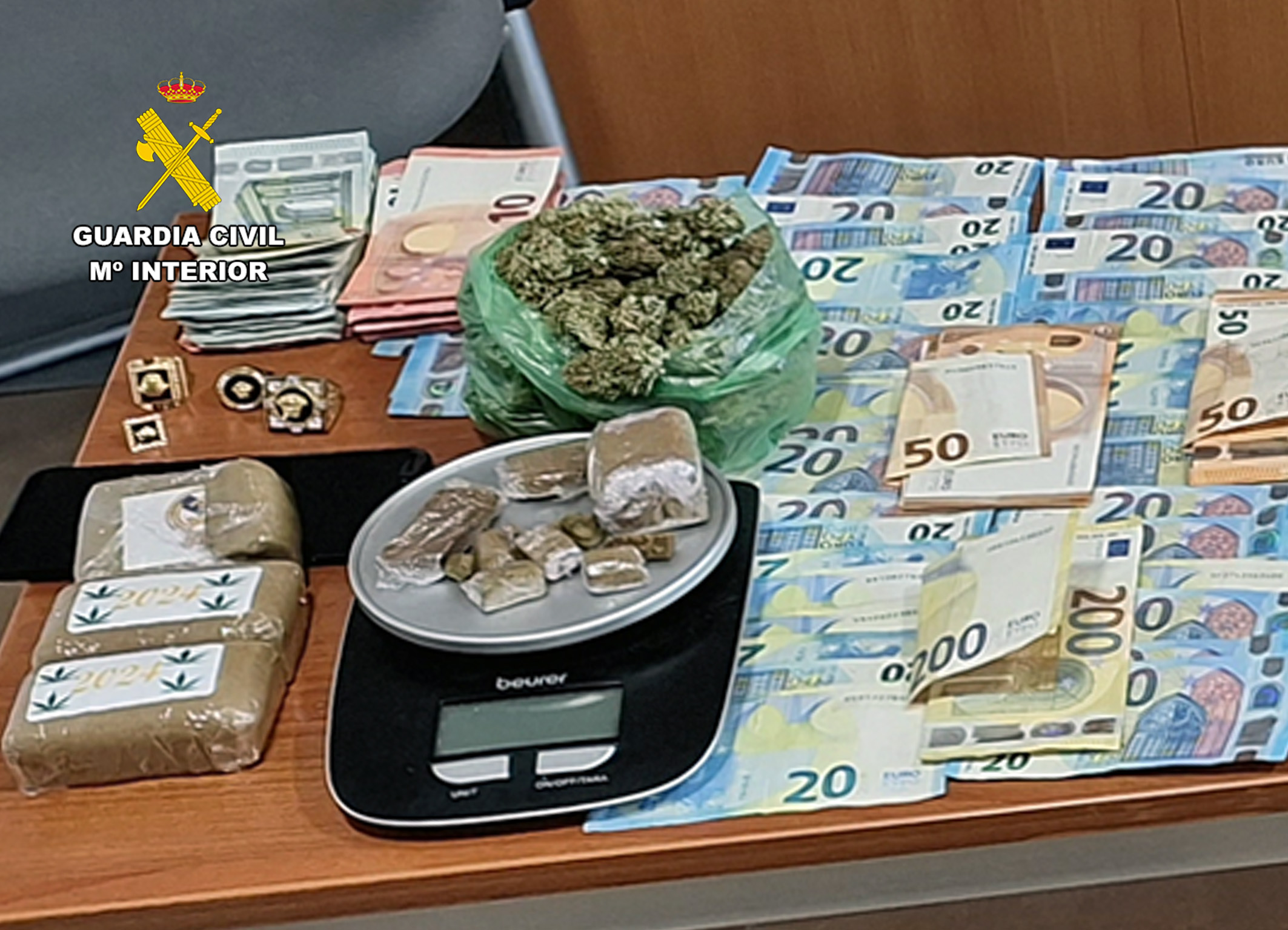 Una vez obtenidos todos los indicios necesarios, la Guardia Civil, en un amplio dispositivo integrado por varias decenas de efectivos, ha llevado a cabo la fase de explotación de la operación, en la que se ha practicado de forma simultánea la entrada y el registro de ambos inmuebles, donde se han incautado 400 gramos de hachís, 100 gramos de marihuana, útiles empleados para la elaboración de las dosis, como básculas de precisión, más de 22.000 euros en efectivo, piezas de joyería que al parecer se utilizaron como moneda de cambio por la adquisición de droga y un arma blanca tipo machete.
