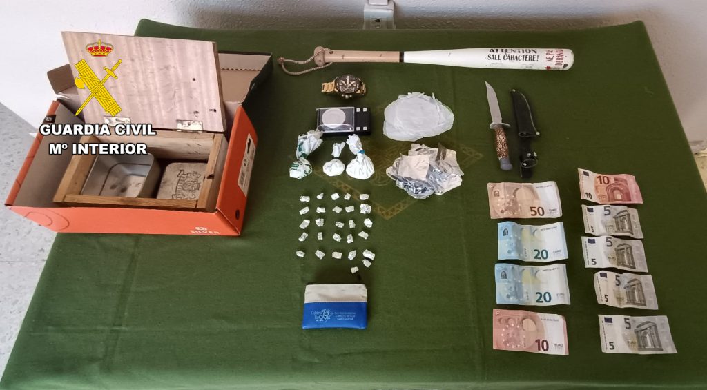 La Guardia Civil de la Región de Murcia ha detenido in fraganti en el casco urbano de Torre Pacheco a un presunto vendedor ambulante de droga que distribuía cocaína y base de cocaína, al que se le han incautado 300 dosis, dinero en efectivo, armas blancas y un completo kit para la venta de estupefacientes.