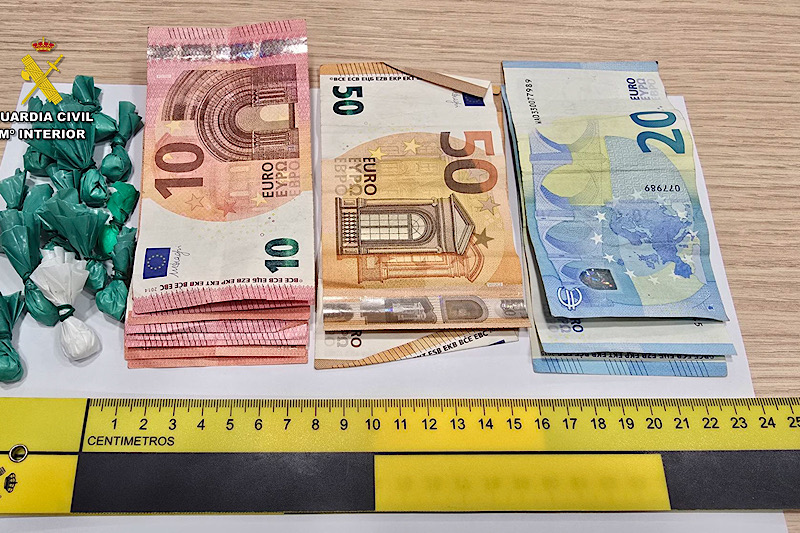 Los efectivos de la Benemérita, tras un exhaustivo registro, hallaron un elevado número de dosis de cocaína y efectivo, que se presume que procedía de la venta de drogas, por lo que se llevó a cabo la detención del sospechoso.