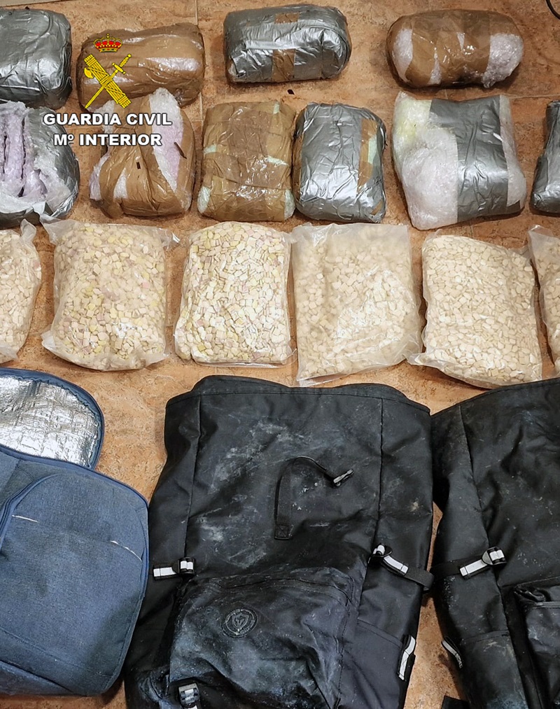 La embarcación transportaba varias mochilas y 14 garrafas de combustible. Dentro de las mochilas, los agentes hallaron numerosos bultos, repletos de pastillas de distintos colores, al parecer estupefacientes, por lo que se procedió al traslado de la lancha y del tripulante hasta el puerto pesquero de Mazarrón.
