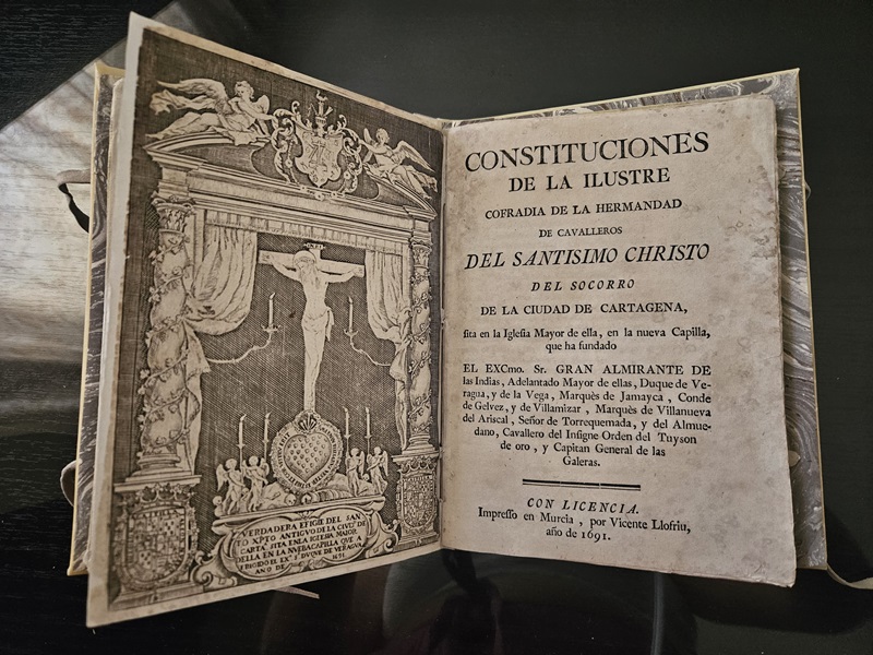 El hallazgo reviste una especial importancia, ya que se trata de una obra impresa en Murcia por Vicente Llofriu en el mismo año de la fundación de la Cofradía, que tuvo lugar bajo el patrocinio del Duque de Veragua. El noble ordenó construir una capilla en la Iglesia Mayor de Cartagena para rendir culto al Cristo del Socorro, al que atribuyó la curación milagrosa de su hijo Manuel, enfermo de gravedad y sanado tras una procesión de rogativa celebrada en 1689.