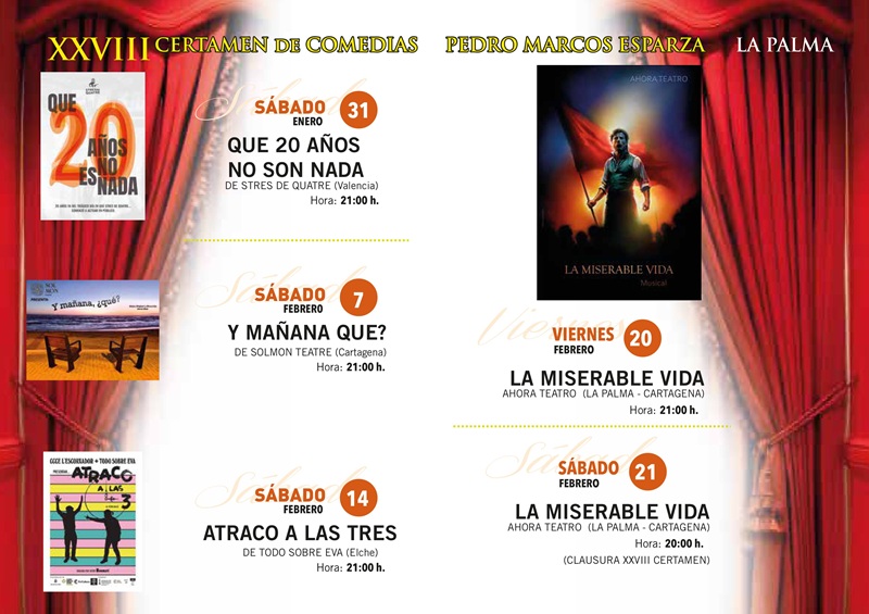 La Palma vuelve a apostar un año más por el teatro con el XXVIII Certamen de Comedias Pedro Marcos Esparza, que se celebrará del 31 de enero al 21 de febrero en el Centro Cívico de la diputación. Cuatro propuestas de compañías de Cartagena, Elche y Valencia protagonizan el programa de esta edición, disponible adjunto a esta noticia.