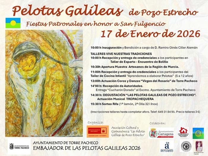 La degustación de pelotas galileas, encuadrada dentro de las fiestas patronales en honor a San Fulgencio, es el acto final de una jornada cargada de actividades en el Huerto de Paco Saura, que incluye talleres, muestras artesanas, actuación de coros y danzas y, entre otros, el nombramiento del Ayuntamiento de Torre Pacheco como embajador de las pelotas galileas.