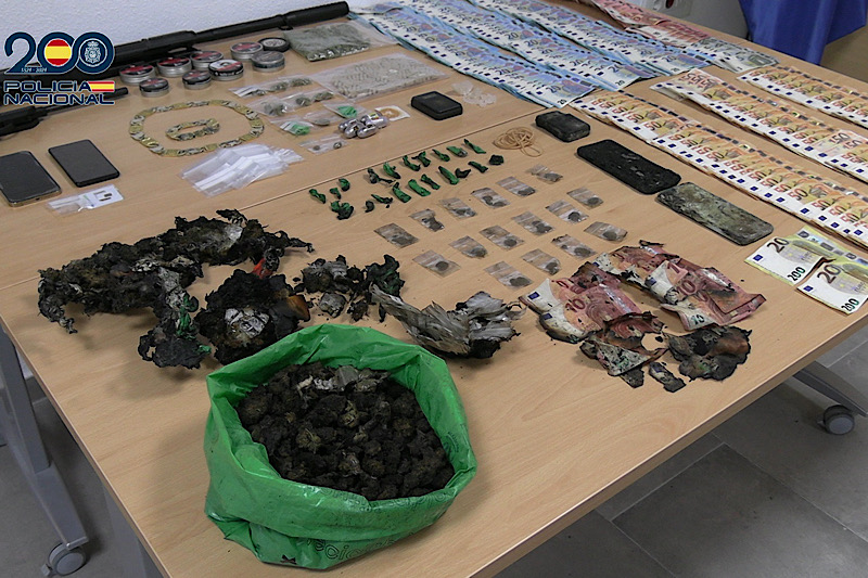 Finalmente los agentes pudieron acceder pudiendo intervenir diversas cantidades de cocaína, hachís, 153 píldoras de polvo de ángel (PCP) y 730 gramos de cogollos de marihuana predispuestos para su venta. También se intervino dos balanzas, una escopeta y pistola de perdigones, casi 9.000 euros en efectivo y joyas con un peso de 350 gramos de oro que tendrían un valor cercano a los 76.000 euros.