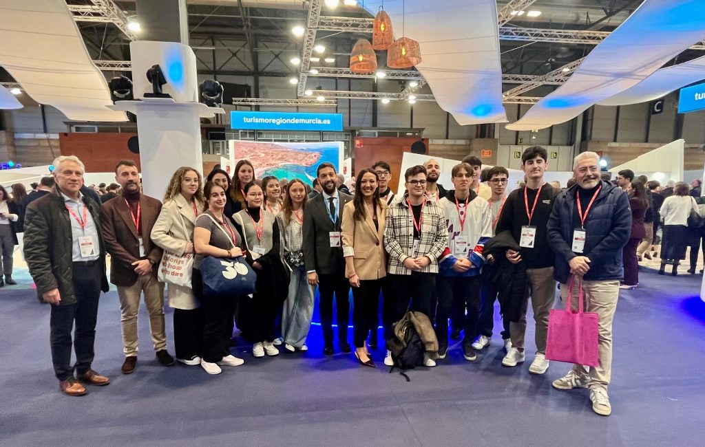 Pie de foto: La consejera Carmen Conesa y el director del Instituto de Turismo, con un grupo de estudiantes de Turismo ante el estand de la Región en Fitur.
