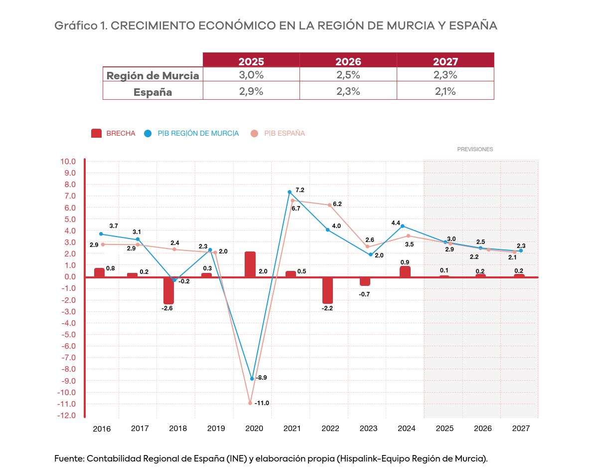 Tras liderar el ranking regional en 2024, según los últimos datos de Contabilidad Regional (CRE) publicados por el INE, el crecimiento de la Región de Murcia para el periodo 2025-2027 ha sido revisado levemente al alza. Pese a la incertidumbre global, se estima que el PIB de la Región de Murcia aumentó un 3,0% en 2025, cifra levemente superior al incremento del PIB español, previéndose un incremento del 2,5% y del 2,3%, respectivamente, en los dos siguientes ejercicios.