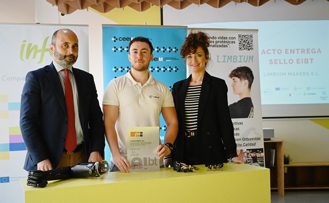 El director del Instituto de Fomento (Info), Joaquín Gómez, entregó esta mañana a la ‘startup’ Limbium, la certificación EIBT que distingue a las empresas con alta capacidad tecnológica y productos innovadores.