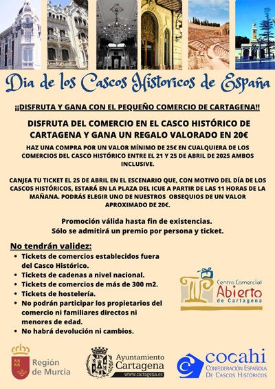 Las tiendas del caco histórico de Cartagena reparten 500 regalos por comprar del 21 al 25 de abril. La iniciativa forma parte de la conmemoración del Día de los Cascos Históricos de España, que ha sido presentada por la edil de Comercio, Belén Romero, y el presidente de Centro Comercial Abierto, Antonio Sánchez.