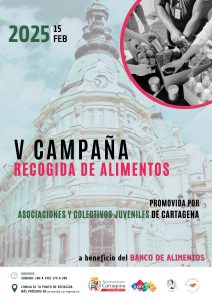 El Ayuntamiento de Cartagena, en colaboración con asociaciones y entidades juveniles del municipio, organiza la quinta edición de la Campaña de Recogida de Alimentos a beneficio del Banco de Alimentos de Cartagena. Esta acción solidaria tendrá lugar este sábado 15 de febrero, con puntos de recogida abiertos en horario de 10:00 a 14:00 horas y de 17:00 a 20:00 horas.