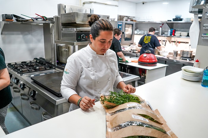 – La chef de Magoga, María Gómez, utilizando el hinojo marino cultivado con agua y nutrientes reciclados.