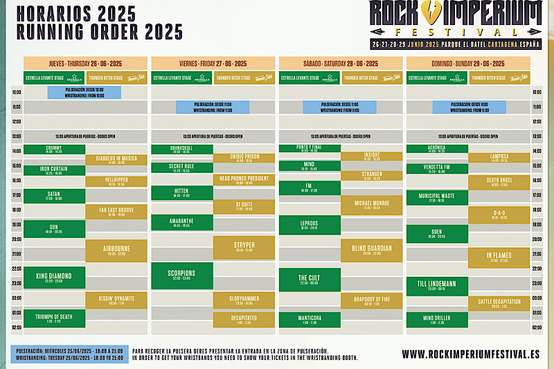 El Festival Rock Imperium de Cartagena desvela los horarios de los conciertos para la edición de 2025, que se celebrará del 26 al 29 de junio en el recinto situado en la Cuesta del Batel. Artistas internacionales como Scorpions, Till Lindemann, King Diamond, The Cult, Blind Guardian, In Flames, Stryper o Airbourne actuarán en el certamen, que cuenta con el patrocinio del Ayuntamiento. El cartel con los horarios detallados está disponible adjunto a esta noticia y en la web www.rockimperiumfestival.es