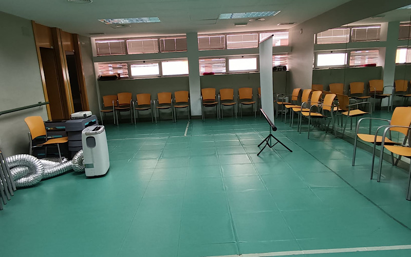 Es lo que ocurre en la planta baja, donde se ubican las salas de formación y grupales, sala de ordenadores, gimnasio, consultas de terapia ocupacional, consultas de enfermería y psiquiatría. En estas estancias hay aparatos portátiles de aire acondicionado, a pesar de ello, las altas temperaturas abarcan más del 50% de la planta.