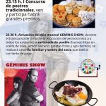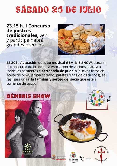 A las 23:15 horas será el turno del ‘I Concurso de postres tradicionales’ en que podrán participar todos el que lo deseen y habrá grandes premios y, a las 23:30 horas actuará el dúo musical Geminis Show que tocará música pop y actual. La asociación de vecinos invitará a todos los asistentes a una ‘Sartenada de pueblo’ compuesta por huevos fritos en aceite de oliva, jamón serrano, patatas fritas y ajos tiernos. Posteriormente se realizará una rifa familiar y el ‘Sorteo del socio’ con el método similar al anterior.